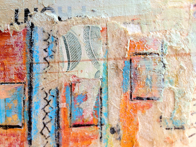 Below are snapshots from the latest piece I'm in the middle of creating. It's a mosaic of vintage papers, stamp work, acrylics, postage stamps, writings and letters.